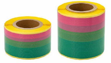 積層養生テープは、図-1のように緑、青、桃色のフィルムクロステープ及び布テープが積層されたものであり、テープ幅は130、80mmの2種類、巻長さはいずれも10mである。同テープを大きく分類すると、4層構造になっており、1度のテープ貼付で4回分の塗り分け工程の養生ができる特徴を有している。1層目(最上層)~3層目は、各層2色のフィルムクロステープから構成されており、各層の上層は桃色のフィルムクロステープに固定し、緑色と青色のフィルムクロステープを交互に配置している。