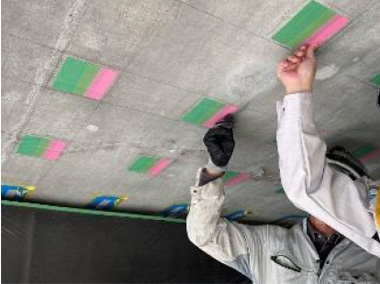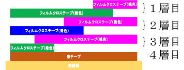 このことで重ね貼り位置が視認でき、各層桃色のフィルムクロステープから先に剥がすことで、スムーズな撤去作業を可能とする。4層目(最下層)は、コンクリート面への付着性が良好且つ剥離時に糊残りが少ない布テープの単層構造を採用している。