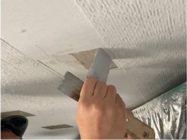 中塗り、上塗りの順で材料を塗布し、上塗り剤硬化後、4層目の布テープの中央部にカッターで切り込みを入れ、その切れ込みをきっかけとし、4層目を撤去した。なお、4層目撤去後、窓に粘着剤の残留、塗布材の過度な浸み込みは見られず、綺麗な仕上がりであった。