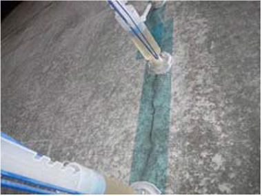 シールテープをひび割れに沿って、シワや気泡が発生しないように強く圧着しながら貼付する。この際、注入時に注入材が漏れ出さないように、ひび割れとシールテープとの縁端は20mm以上確保する。ひび割れが曲がっている場合等で20mm以上確保できない場合は、シールテープを重ねて貼付する。貼付する際の長手方向の重ね長は50mm以上確保する。