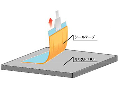 表には、比較のため一般的なシール材の結果も併記する。粘着力は、JIS R 5201 に準じた研磨モルタルパネルにシールテープを貼付し、所定の時間経過後、JIS Z 0237に準じてモルタルパネルに対して90°の方向になるように引っ張り、シールテープが剥がれる時の荷重を測定した(図-1)。