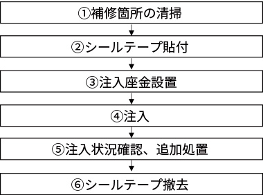 注入開始後、注入口からひび割れに沿って注入材が充填されていく状況を目視で確認する。空気溜りによって注入が中断している場合は、シールテープにカッターナイフ等で新たに切込みを入れ、空気を抜きながら注入を続ける。ひび割れに注入材が充填されたことを確認し、シールテープで切込み部を閉塞する。なお、空気を抜いても注入材が充塡されない場合は、ひび割れが連続していないものとし、新たに注入座金を接着して注入を行う。