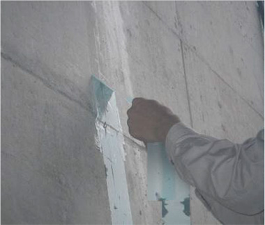 注入材の硬化後、注入器具を撤去し、シールテープを剥がす。シールテープは人力で容易に剥がせるため、ディスクサンダー等の工具は不要である。また、注入座金を残置したままでもシールテープを剥がすことが可能である。なお、シールテープ撤去後はコンクリート面に粘着剤が残留しないため、後処理も不要である。