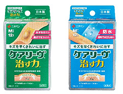 「ケアリーヴ治す力」シリーズはモイストヒーリング(湿潤療法)で痛みを和らげ、あかぎれを早く治します。「あかぎれ保護バン」シリーズは、乾燥した肌を保護・保湿します。