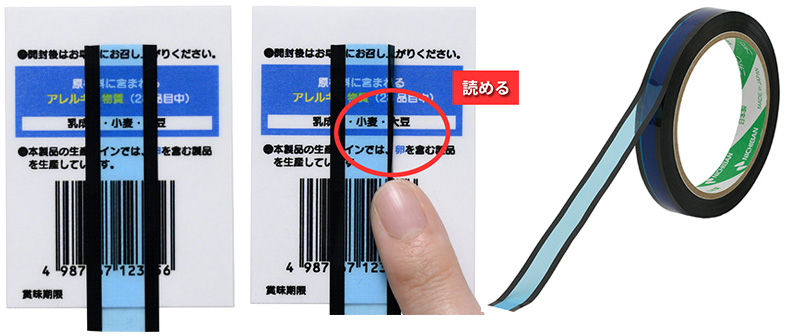 本製品はテープの両サイドが黒色、中央が青色で半透明のテープです。値引き商品の元のバーコードの上から貼り付けることで、赤外線リーダー・スマホの画像認証ともに誤った読み取りを防止します。さらにテープの両サイドの黒色ラインには粘着剤が付いていないので、テープめくると表示内容を確認することができます。また、テープ自体に手切れ加工がされているのでテープカッター無しでも使用可能です。