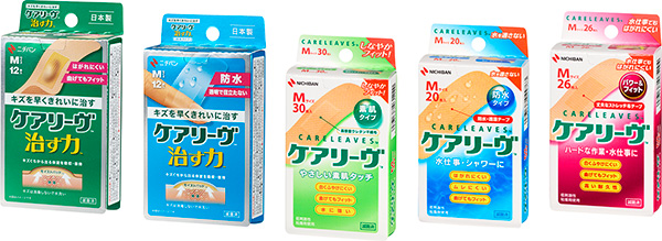 ニチバンは1997年に「肌へのやさしさ」と「フィット感」を兼ね備えた「ケアリーヴ™」を発売しました。柔らかく通気性に優れた高密度ウレタン不織布素材の救急絆創膏です。スタンダードな「ケアリーヴ™」のほか、防水性に優れた「ケアリーヴ™防水タイプ」、丈夫なストレッチ布テープを採用した「ケアリーヴ™パワー&フィット」、大きなキズもしっかりカバーできるシリーズ最大サイズ「ケアリーヴ™超大判」、楽しく貼れるジュニアサイズの「ケアリーヴ™キャラクター」を展開しています。