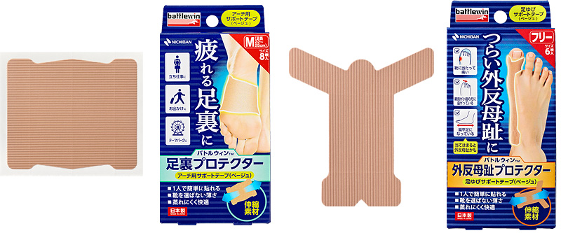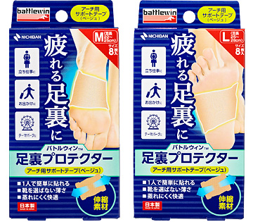 こうした足裏の疲れを予防するために、テープを貼って足のアーチをサポートする「バトルウィン™足裏プロテクター」を開発しました。本製品はニチバンのテーピング理論に基づいて開発したプレカットテーピングで、一人で簡単に貼ることができます。薄いテープ素材なのでスニーカー、革靴、パンプスなど、靴を選ばず使用可能です。足の大きさに合わせて選べる2サイズ展開です。立ち仕事をはじめ、旅行やテーマパークなど、日常生活の様々なシーンでご活用いただけます。